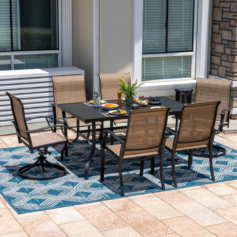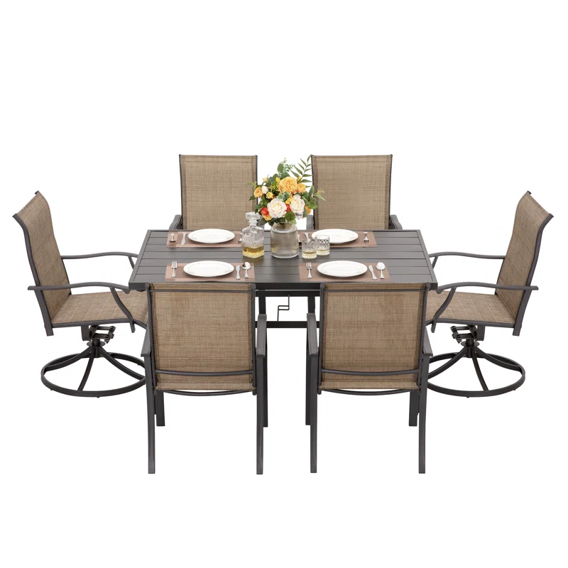 This classic patio dining set brings a timeless feel to your outdoor gatherings. The set includes a rectangular dining table, four dining chairs, and two swivel chairs, comfortably accommodating up to six people. Each piece is crafted from iron with a black finish, giving the set a cohesive look. We love that the chairs feature a sling-back design and swivel functionality for added comfort and convenience. An umbrella hole in the table allows for easy shade installation on sunny days. This set is UV- and rust-resistant for holding up to everyday use.